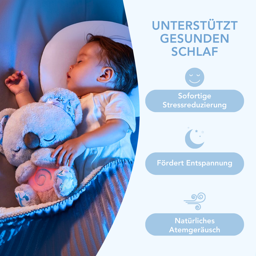 Mit sanften Atemgeräuschen und beruhigenden Bewegungen schafft der Schlummer Koala eine gemütliche Schlafumgebung. Aus superweichem, hautfreundlichem Material gefertigt, ist er sicher und flauschig zum Kuscheln. Leicht zu transportieren, sorgt dieser niedliche Koala überall für entspannte Träume.